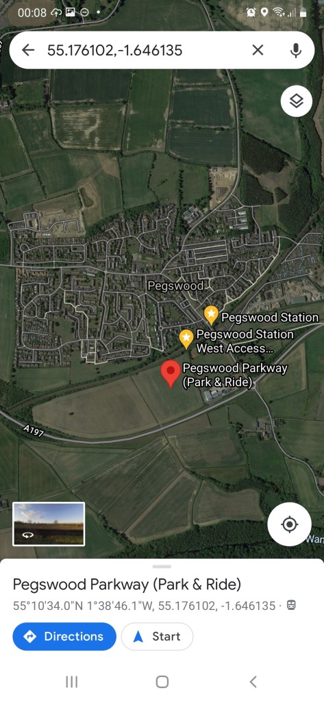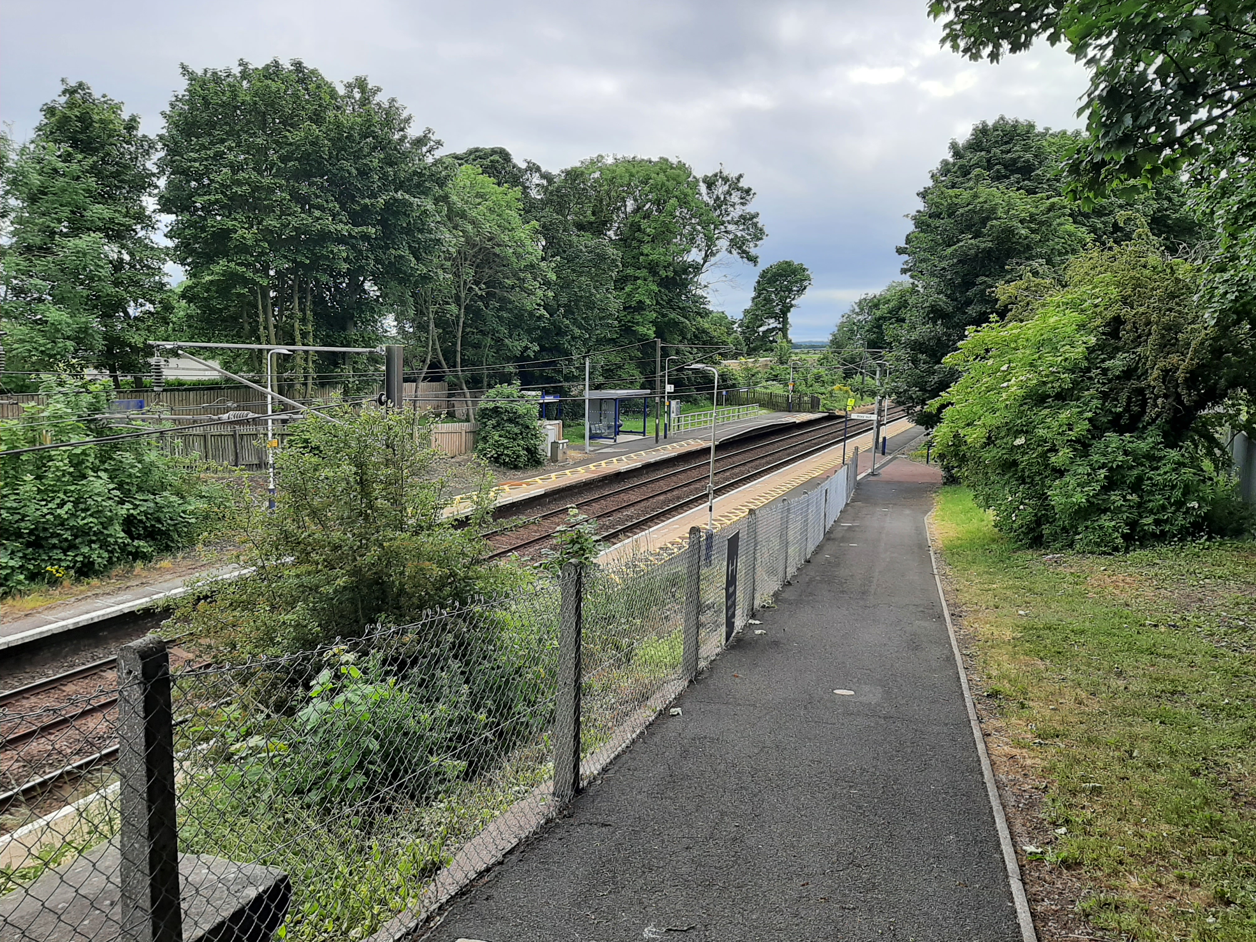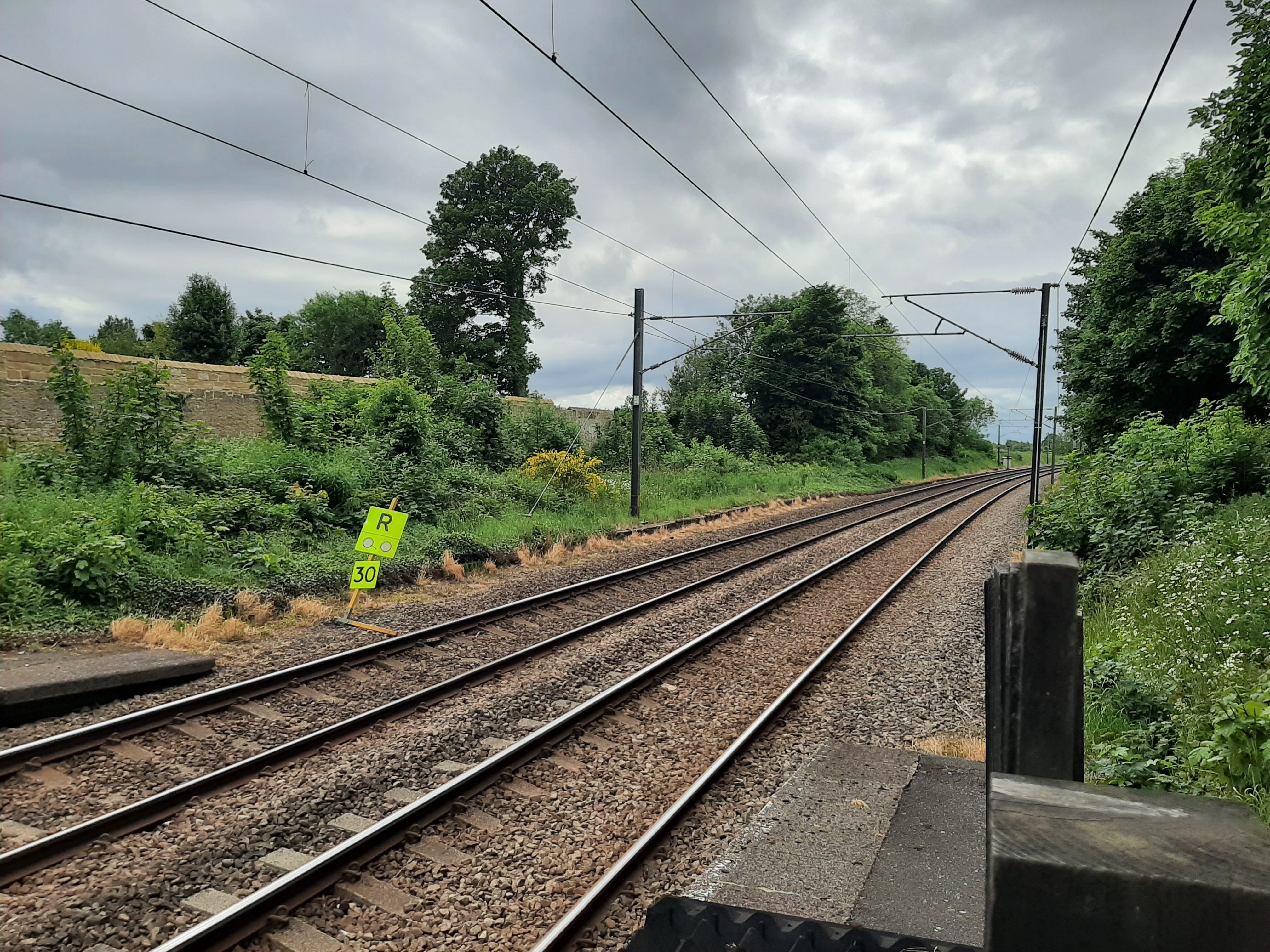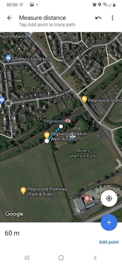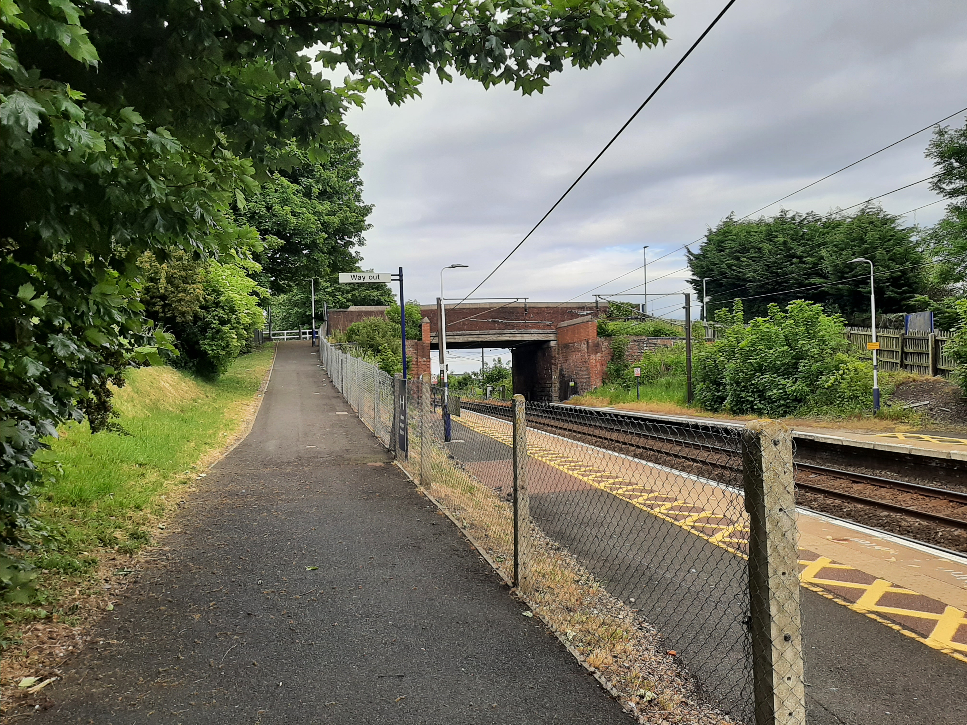 1. Pegswood Station already exists: Pegswood is unusual to be almost directly bordering two large fields to the SW of the station, and with amble space between running lines and the apparent boundary it shouldn’t be too difficult to drive a pathway from the current up (southbound) platform to the corner of these fields. Measuring from Google Maps would make this about a 60m long path.