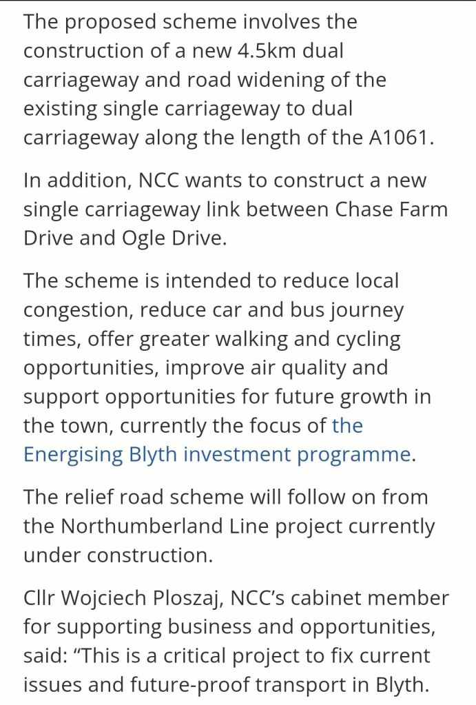 Whilst ‘the scheme is intended to reduce local congestion, reduce car and bus journey times… improve air quality amd support opportunities for future growth in the town…’ the best of intentions don’t always work – road widenings rarely, if ever lead to traffic reduction, often quite the opposite; meaning the dualling of the A1061 presents a real risk of making traffic in Blyth worse, not better.