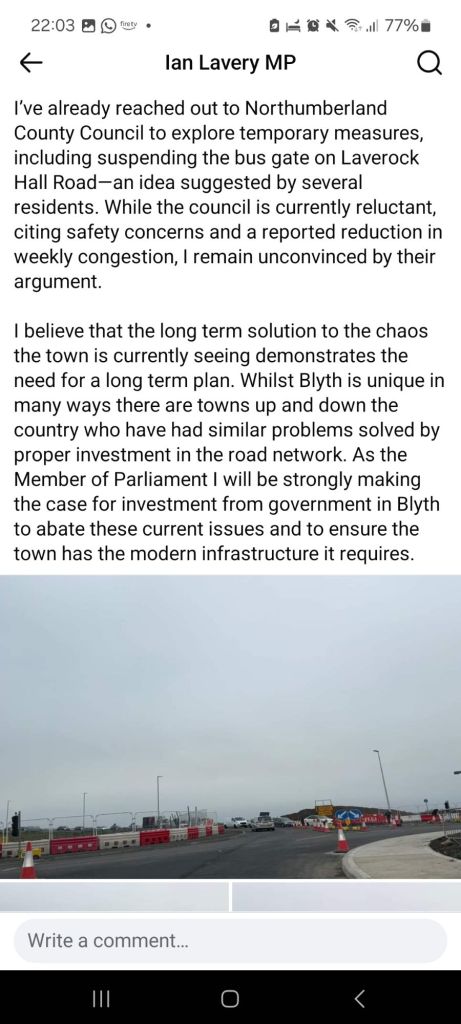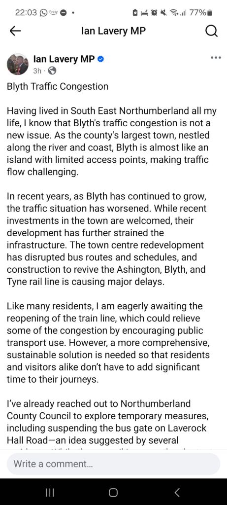 Blyth has long had traffic problems, with routes such as Cowpen Road notorious for traffic as long as I can remember, and has recently been acknowledged in a Facebook post from the Ian Lavery MP (see below).
