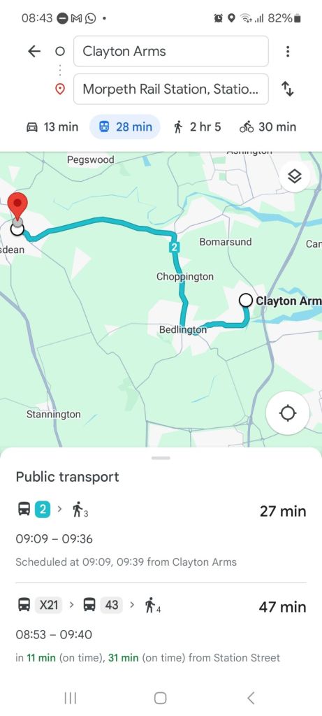 At time of writing, the only north-south route open to passengers in Northumberland is the East Coast Main Line (ECML), which primarily has semi-fast (limited stop) services calling at Berwick, Alnmouth (for Alnwick) and Morpeth. The difficulty here is the travel from towns such as Bedlington, Blyth etc to particularly Morpeth Station, which is served by comparatively few buses and due to winding routes offer slow connections; frok the Clayton Arms to Morpeth Station takes 28mins according to Google Maps (see image below, taken on Friday 5th Jan 2024).